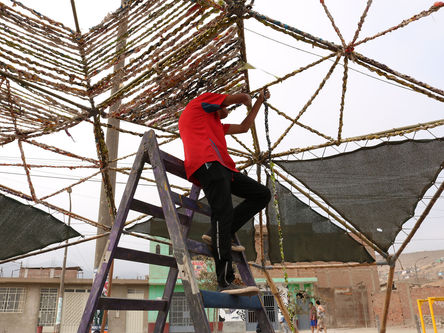 Como artista invitada y practicante en Puckllay, les propuse al grupo de estudiantes adolescentes realizar un proyecto de arte con una temática local. Todo lo que sucedió después fue el resultado del proceso mismo. El Parque Infantil de Nueva Jerusalén se encuentra en medio de dos centros educativos, por lo que el flujo de tránsito de niños y adolescentes es muy recurrente. Sin embargo, la zona carece de equipamiento adecuado para atender las necesidades de esparcimiento de esta población. Así surgió el interés de hacer una intervención para mejorar las condiciones. La ausencia de sombra era uno de los principales problemas. Durante el verano, Lomas de Carabayllo es muy caluroso y los vecinos de la zona dejaban de ir al parque durante el día por la intensidad del sol. Es por ello que se decidió construir una pérgola dentro del parque tejiendo más de 300 metros de bolsas de plástico recicladas. Este espacio se propone como un punto de encuentro para las familias de Nueva Jerusalén y poder así aumentar el uso del mismo.