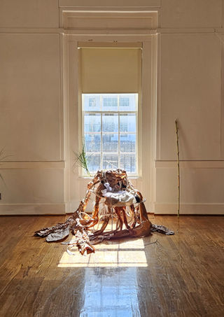 La propuesta partió de una reflexión compartida: la piel como territorio que habitamos, un espacio que contiene memoria y que, en este caso, reunía las experiencias y lenguajes de tres disciplinas distintas —el textil, la escenografía y la coreografía— para explorar las múltiples posibilidades de transformación que emergen de la creación colectiva. La escultura Parénquima, traída desde Lima, fue el punto de partida y motor de la obra. Primero se presentó como “madre” y luego como “hija”, inspirando la forma de nuevas piezas tejidas que crecieron y superaron su escala. Durante cinco días de trabajo con recursos locales —hojas de junco del río Black Warrior, ropa donada, papel reciclado y sogas— se produjeron tres vestuarios que evocaban cuerpos en permanente metamorfosis.